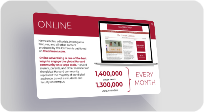 6 LEADERBOARD 728x 90pi ONLINE Newsarticles,editorials, investigative PRIMARY 300x 600 pi features, and all other content producedbyTheCrimsonispublished thecrimson.com㠀 on BOX 300 x 250 pi Onlineadvertisingisoneofthebest waystoengagetheglobalHarvard communityonalargescale. Harvard alumni,parents,andothermembersof theglobalHarvardcommunity representthemajorityofourdigital 1,400,00 EVER夀 audience,aswellasstudentsand pageviews faculty on campus. MONT䠀 1,300,00 } uniquereaders