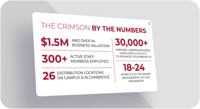 2 THECRIMSONBYTHENUMBERS ANDOVERIN 30,000+ $1.5M BUSINESSVALUATION HARVARDUNDERGRADUATES, GRADUATES,&FACULTY TOPROMOTEYOURBRANDTO ACTIVESTAF䘀਀ MEMBERSEMPLOYED 300+ 18-24 DISTRIBUTIONLOCATIONS YEARSOLDISTHEMAJOR ONCAMPUS&INCAMBRIDGE 26 DEMOGRAPHICOFOUR READERSHIP