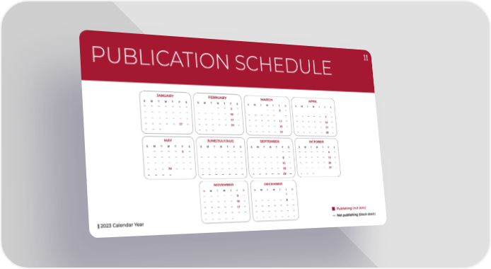11 PUBLICATIONSCHEDULE e⤀ ed dat Publishing (r k dash) publishing (blac Not — | 2023 Calendar Year