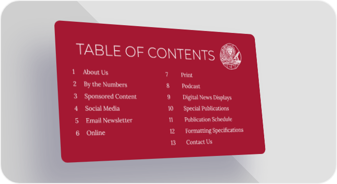 TABLEOFCONTENTS AboutUs 㜀 Prin琀 ㈀ BytheNumber猀 㠀 Podcas琀 ㌀ SponsoredConten琀 㤀 Digital News Display猀 㐀 Social Media 1 Special Publication猀 㔀 Email Newslette爀 1 Publication Schedul攀 6 Onlin漀 1㈀ Formatting Speci昀椀cation猀 13 ContactUs