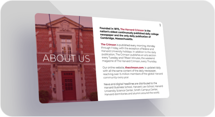 1 Foundedin1873,TheHarvardCrimsonisthe nation’s oldest continuously published daily college newspaperandtheonlydailypublicationof Cambridge,Massachusetts㠀 TheCrimson is published every morning, Monday throughFriday,withtheexceptionoffederaland HarvardUniversityholidays.Inadditiontothedaily publication, The Crimsonpublishesanartssection everyTuesdayandFifteenMinutes,theweekend magazineofTheHarvardCrimson,everyThursday㠀 ABOUTUS thecrimson.com Ouronlinewebsite, , is updated daily withall the samecontentofthedailynewspaper, reachingover15millionmembersoftheglobalHarvard communityeveryyear㠀 Newsanddigitalheadlinesaredistributedtothe HarvardBusinessSchool,HarvardLawSchool,Harvard University Science Center, Smith CampusCenter, Harvarddormitoriesandalumniaroundtheworld⸀