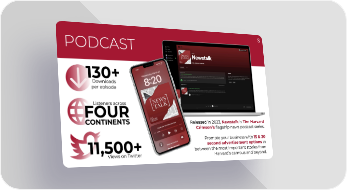 8 jjohnharvohnharvarard36d36 PODCAST 130+ Download猀 perepisode Listeners acros猀 FOUR CONTINENTS Releasedin2023,NewstalkisThe Harvard Crimson’s昀氀agshipnewspodcastseries㠀 Promoteyourbusinesswith 15&30 secondadvertisementoptionsin betweenthemostimportantstoriesfrom 11,500+ ViewsonTwitte爀 Harvard’s campusandbeyond.